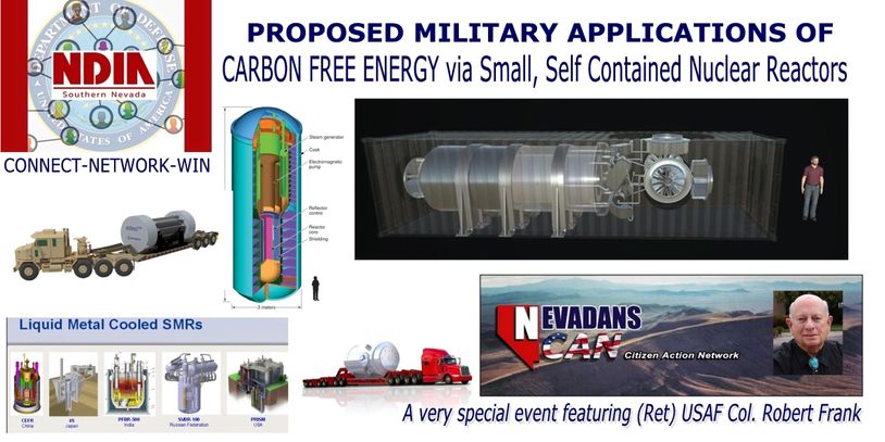 NevadansCAN Chairman and Energy Security Action Committee Leader, USAF Retired Colonel Bob Frank overviewed the possible path forward to establish Nevada as the National Engineering & Test Center for Carbon Free Power, with direct applicability to Military operations. An immediate application would would be for a small, self contained Nuclear Reactor to 24/7/365 power Creech's unique, global, active war-fighting mission independently from the Civilian Grid.